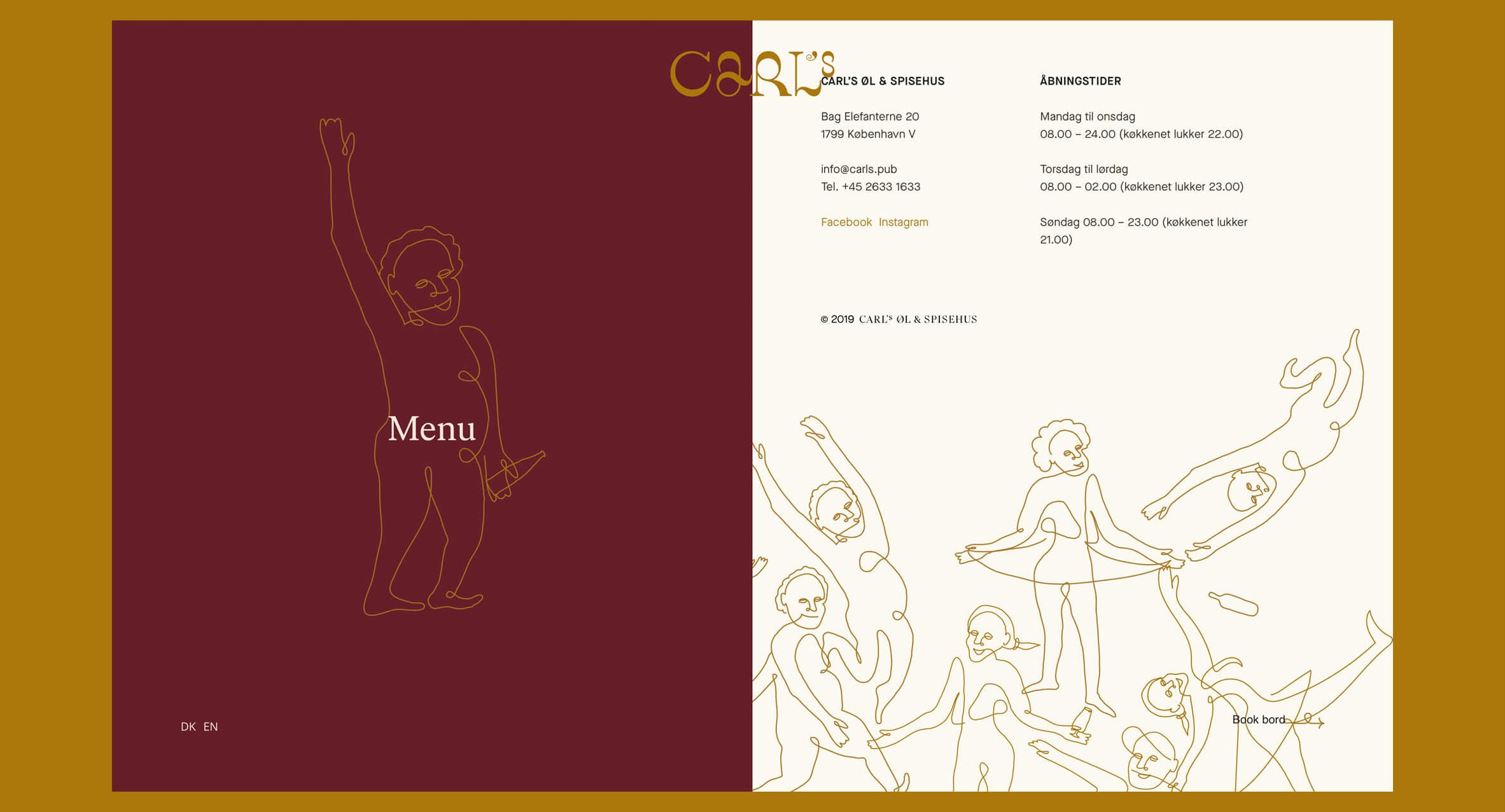 Carl's Øl og Spisehus är en restaurang i ett gammalt bryggeri som grundades 1847 i Köpenhamn, Danmark. Sedan öppnandet har restaurangen expanderat med restauranger på Köpenhamns flygplats. Konceptet betonar värdet av möten mellan människor, där man kan komma samman, skapa minnen och ha roligt tillsammans. Jag blev ombedd av Bold Scandinavia att skapa illustrationer som en del av den grafiska identiteten dom tagit fram för Carls. Illustrationerna återspeglar konceptet, att njuta av de goda sakerna i livet – vänner, mat och massvis av öl.