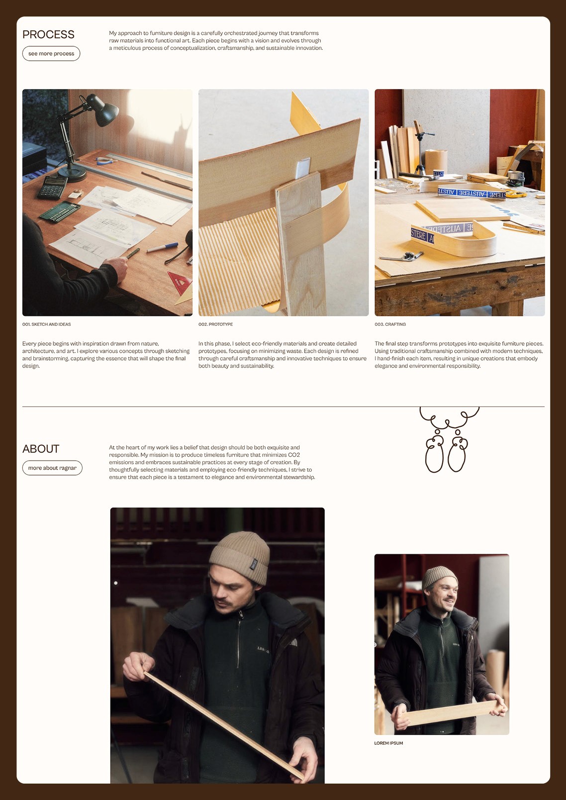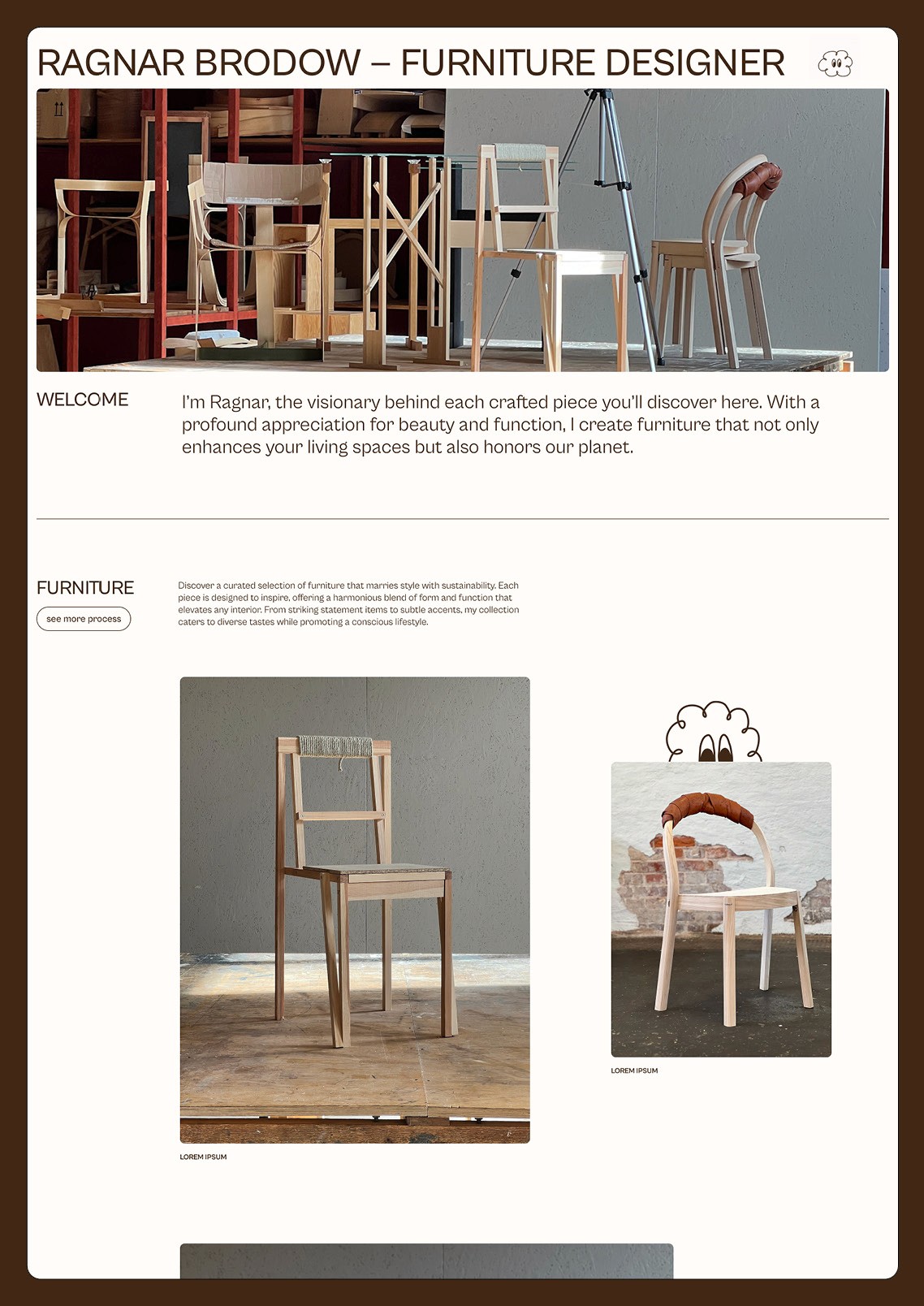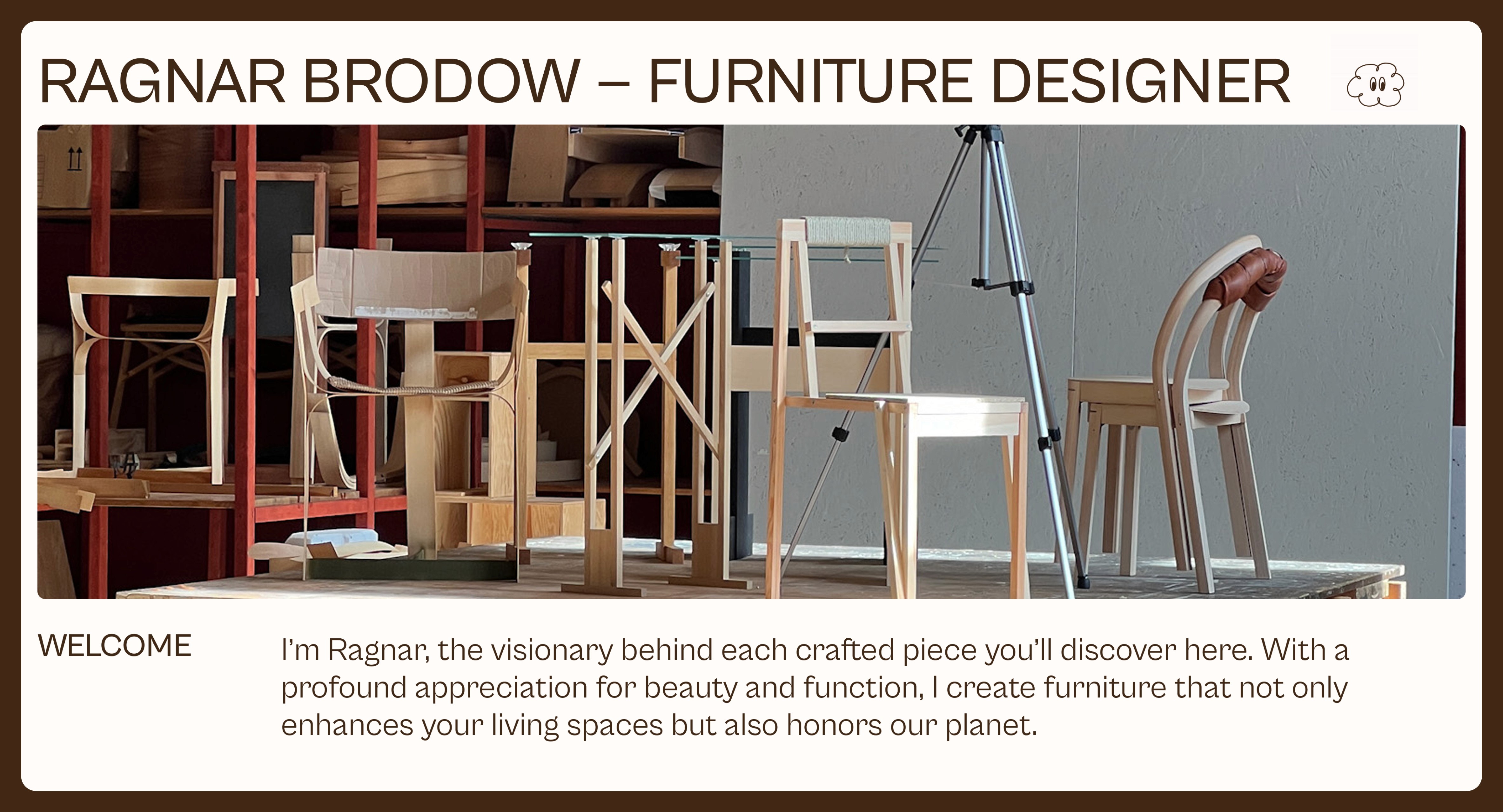 Ragnar Brodow är en svensk möbeldesigner med ett skarpt öga för detaljer och djup förståelse för material och konstruktion. Studio Lepost tog fram ett grafiskt uttryck och hemsida till Ragnar som linjerar med hantverket i hans praktik.